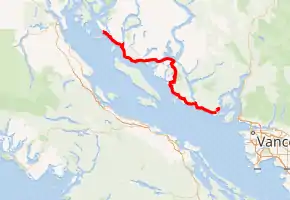 The total distance of Highway 101, including the ferry link, is approximately 156 kilometres (97 mi). The highway begins in the south at the BC Ferries terminal at Langdale, which connects the Sunshine Coast to Vancouver via a ferry route across Howe Sound to Horseshoe Bay. The southern land section of Highway 101 is 80 kilometres (50 mi) long, and includes from south to north, the communities of Gibsons, Roberts Creek, Sechelt, Halfmoon Bay and Pender Harbour. The ferry link across the Jervis Inlet lasts 9.5 nautical miles (17.6 km) between Earls Cove to the south and Saltery Bay to the north.[4] The 59-kilometre-long (37 mi) northern land section of Highway 101 includes, from southeast to northwest, the hamlets of Stillwater and Lang Bay, the city of Powell River, and the community of Lund, at the northern terminus of the highway.