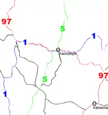 | Kamloops | 192.22 | 119.44 | 362 | Afton | West end of Hwy 1 / Hwy 97 concurrency | ||