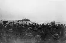Fortune had detached Arkforce comprising the 154th Infantry Brigade, A Brigade of the Beauman Division, two artillery regiments and engineers to guard Le Havre. Arkforce moved on the night of 9/10 June towards Fécamp, where most had passed through before the 7th Panzer Division arrived. A Brigade managed to force its way out but lost the wireless truck for liaison with the 51st (Highland) Division and Stanley-Clarke ordered Arkforce on to Le Havre.[62] On 9 June, the Admiralty ordered Le Havre to be evacuated and the Commander-in-Chief, Portsmouth sent a flotilla leader, HMS Codrington across the channel, accompanied by six British and two Canadian destroyers, smaller craft and Dutch coasters (known as schuyts). On 10 June, HMS Vega escorted three blockships to Dieppe and two were sunk in the approach channel.[66] Beach parties landed at Le Havre on 10 June and the evacuation began on 11 June, hindered somewhat by Luftwaffe bombing. The troopship SS Bruges was beached and the electric power was cut, rendering the cranes on the docks useless and improvised methods to embark heavy equipment were too slow. On 12 June, RAF fighters deterred more raids and the quartermaster of the 14th Royal Fusiliers got the transport away over the Seine via the ferry at Caudebec and ships at Quillebeuf at the river mouth.[67] The Navy got 2,222 British troops from Le Havre to England and 8,837 were taken to Cherbourg to join the forces being assembled for the new II Corps (Second BEF).[68]