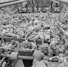 From 15–25 June, British and Allied ships were covered by five RAF fighter squadrons in France, assisted by aircraft from England as they embarked British, Polish and Czech troops, civilians and equipment from the French Atlantic ports, particularly St Nazaire and Nantes. The Luftwaffe attacked the evacuation ships and on 17 June, sank the troopship RMS Lancastria in the Loire estuary. About 2,477 passengers and crew were saved but thousands of troops, RAF personnel and civilians were on board and at least 3,500 people died.[72] Some equipment was embarked but ignorance about the progress of the German Army and alarmist reports, led some operations to be terminated early and much equipment needlessly was destroyed or left behind. About 700 tanks, 20,000 motor bikes, 45,000 cars and lorries, 880 field guns and 310 larger equipments, about 500 anti-aircraft guns, 850 anti-tank guns, 6,400 anti-tank rifles and 11,000 machine-guns were abandoned.[73]
