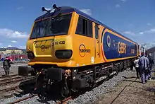 Following the privatisation of British Rail and the EWS purchase of Railfreight Distribution, the intention was to paint the RfD Class 92s into the EWS gold and dark red colours. In the end, only two locomotives received EWS livery (92001 and 92031).[20] Locomotive no. 92001 had an additional three flags (English, Welsh and Scottish) below the EWS logo on the cabsides, the only one so treated. The rest of the locomotives had a large EWS Logo applied halfway along the side.