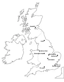 Being a national championship, the British Touring Car Championship has visited circuits throughout the United Kingdom over its long history. Currently the series visits eight different tracks in England and Scotland over the course of ten meetings. These tracks are: Brands Hatch (Indy Layout), Donington Park, Thruxton Circuit (the fastest track ever visited by the BTCC, with an average speed of 111.31 mph, set by Andrew Jordan during qualifying in 2014), Oulton Park, Croft Circuit, Snetterton Motor Racing Circuit, Knockhill Racing Circuit, and Silverstone Circuit (National and International layouts), with a return to Brands Hatch (GP Layout) at the end of the season.