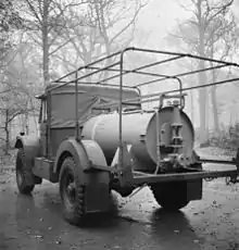 A mobile flame trap comprised surplus bulk storage tanks on trucks, the contents of which could be hosed into a sunken road and ignited. A static flame trap was prepared with perforated pipes running down the side of a road connected to a 600-imperial-gallon (2,730 L; 720 US gal) elevated tank. Usually, gravity sufficed but in a few cases a pump assisted in spraying the mixture of oil and petrol.[103]