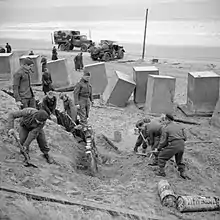 Beaches were blocked with entanglements of barbed wire, usually in the form of three coils of concertina wire fixed by metal posts, or a simple fence of straight wires supported on waist-high posts.[33] The wire would also demarcate extensive minefields, with both anti-tank and anti-personnel mines on and behind the beaches. On many of the more remote beaches this combination of wire and mines represented the full extent of the passive defences.