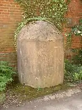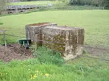 The simplest of the removable roadblocks consisted of concrete anti-tank cylinders of various sizes but typically about 3 feet (0.91 m) high and 2 feet (61 cm) in diameter; these could be manhandled into position as required.[57] Anti-tank cylinders were to be used on roads, and other hard surfaces; deployed irregularly in five rows with bricks or kerbstones scattered nearby to stop the cylinders moving more than 2ft (0.60m). Cylinders were often placed in front of socket roadblocks as an additional obstacle.[58] One common type of removable anti-tank roadblock comprised a pair of massive concrete buttresses permanently installed at the roadside; these buttresses had holes and/or slots to accept horizontal railway lines or rolled steel joists (RSJs). Similar blocks were placed across railway tracks[59] because tanks can move along railway lines almost as easily as they can along roads. These blocks would be placed strategically where it was difficult for a vehicle to go around – anti-tank obstacles and mines being positioned as required – and they could be opened or closed within a matter of minutes.[60]