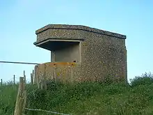 The beaches themselves were overlooked by pillboxes of various types. These were sometimes placed low down to get maximum advantage from enfilading fire, whereas others were placed high up making them much harder to capture. Searchlights were installed at the coast to illuminate the sea surface and the beaches for artillery fire.[39][40][41]
