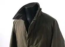 English country jackets usually include waxed and quilted jackets. The traditional style is dark olive green with a brown corduroy collar which is based on the original colour palette used when they were first produced, which also included navy as opposed to dark olive green. A gilet is also a popular style of country jacket.[6] Tweed jackets and coats are also worn to protect against weather due to the durability of the material. Fleece jackets and gilets have also become part of country attire in Britain.