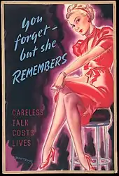 Originating in a 1940 campaign with the catchphrase "Be like Dad, keep Mum," the best-known image from this campaign is the 1942 poster "Keep mum, she's not so dumb" by the architect and artist Gerald Lacoste.[74][75] It depicts a glamorous blonde woman reclining, and officers from each branch of the Armed Forces about her talking to each other. It is implied that the officers are talking military secrets, on the (wrongful) assumption that the woman is only a "dumb blonde" and so will not pass these secrets onto the enemy.