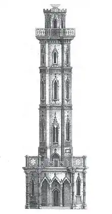 The tower is in an elaborate Gothic revival style,[5] the design being variously attributed to Robert Adam;[3] or to his brother John[5][10] (who were also employed on other works for the Duke including a remodelling of the interiors of Northumberland House and Syon House in London); to the Duke himself;[5][10] and even to the Duke's French pastrycook.[7]