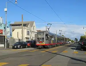 Broad and Capitol is a light rail stop on the Muni Metro M Ocean View line, located in the Ingleside neighborhood of San Francisco, California. The stop opened with the line on October 6, 1925.[1] The line was replaced with buses on August 6, 1939, but streetcar service resumed on December 17, 1944.[2] There are no platforms at the stop; passengers must wait on the sidewalk.