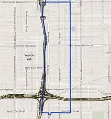 The Broadway-Manchester neighborhood touches Florence on the north, Green Meadows on the east, Vermont Knolls and Willowbrook on the south and Vermont Vista on the west.[2] It is bounded by Manchester Boulevard on the north, San Pedro Street on the east, the Los Angeles City boundary on the south and Interstate 110 on the west.[1]
