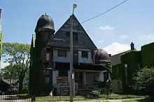 The first new substantial Czech American settlement south of Kingsbury Run was at the intersection of Trumbull Avenue and E. 37th Street.[26] This neighborhood became known in the Czech language as Na Vrsku (On the Hill).[38] In 1892, St. Wenceslas Church began construction of a new church at the intersection of E. 37th Street and Broadway, a block south of Trumbull Avenue. (This structure was not completed until 1899, although services began to be held there much earlier than that).[27] The country road that became Broadway Avenue had existed since the early part of the 1800s, and as more and more Czech Americans moved into the area, development began moving south down Broadway.[26] Czech immigrants brought with them a cultural legacy of gardening, and most new homes in the area consisted of small cottages with front and back yard flower and kitchen gardens.[23][39] New streets were constructed, many with Czech names like Praha and Svoboda.[26] Bohemian National Hall, believed by historians to be the first structure in Cleveland erected by an immigrant group, was constructed at the intersection of Broadway and Mead Avenues in 1897.[38] Banks, churches, and retail stores were built along Broadway Avenue, and by 1900 the intersection of E. 55th and Broadway had emerged as the center of the new Czech community—supplanting the earlier concentration of homes and businesses at Broadway and Trumbull.[26]