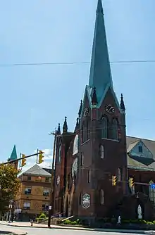The 1890s saw the erection of Our Lady of Lourdes Church, one of the most prominent structures in the neighborhood. The swiftly-growing Czech American community south of St. Wenceslas moved the Roman Catholic Diocese of Cleveland to establish a new parish to serve the middle-Broadway area. In 1882,[39] the diocese authorized Rev. Anton Hynek to purchase property at E. 55th and Hamm Avenue for the new parish.[61] Bishop Richard Gilmour recruited Czech seminarian Stephen Furdek to minister to the new parish. While on his way to the United States, Furdek visited the Our Lady of Lourdes Shrine near the town of Lourdes in France. Furdek promised the Virgin Mary to name the new parish after Our Lady of Lourdes.[39] Although the parish was formally established in 1883,[61] construction of the Gothic Revival church, designed by architects Emile Ulrich and Bernard Van De Velde, did not begin until 1891.[62] Our Lady of Lourdes Church became a central institution in the community. Under Furdek's pastoral care, it grew to more than 6,000 parishioners by 1920. It sponsored more than 45 different chapters, groups, societies and other associated membership organizations, including book groups, a musical drama society, a hunters' and fishers' group, a forestry association, a gymnastics club, and an organization designed to encourage youth to join the military.[63] Our Lady of Lourdes School (which taught first through sixth grades) was founded adjacent to the church in 1905,[64] and staffed by the Sisters of Notre Dame de Namur.[63] Between 1915 and 1955, a convent, gymnasium, and rectory were all added to the Lourdes campus. Instruction in grades seven through nine was added in 1939, and a high school in 1944.[65]