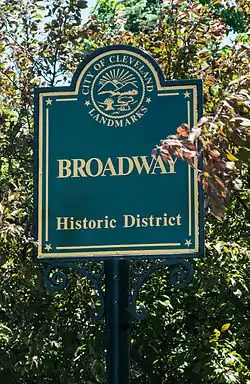 The Broadway Historic District was named a Cleveland Landmark in November 1990.[87] The district is part of Cleveland's Broadway-Slavic Village Statistical Planning Area. Broadway Avenue forms the center of this planning area.[119]