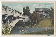 Constructed in 1909, the Broadway Bridge is a three-hinged arch bridge built of concrete.[1] A single span crosses the entire stream, and a balustrade prevents vehicles and pedestrians from falling over the side into the stream.[3] The bridge's designer, A.W. Zesiger, constructed multiple three-hinged arch concrete bridges; one that spanned a creek at Brookside Park in Cleveland was once considered the world's flattest semi-elliptical arch. These two bridges were constructed in a similar manner, although the slightly flatter Cleveland bridge was lighter and smaller than the Greenville bridge, whose location required it to carry heavier loads than a bridge placed in a park.[4] Not long after completing the bridge in Greenville, Zesiger became known for a substantially larger structure: as the Cuyahoga County Bridge Engineer, he helped to supervise the construction of the concrete-and-steel Detroit-Superior High Level Bridge,[5] which was completed in 1917.[1]