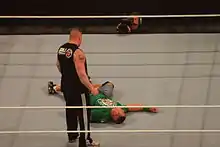 At SummerSlam on August 17, Lesnar defeated John Cena to win the WWE World Heavyweight Championship; during the match he delivered sixteen suplexes (most of which were German suplexes) and two F-5s to Cena, who barely managed any offense.[117] In a rematch at Night of Champions on September 21, Lesnar was disqualified due to Seth Rollins interfering, but retained his championship.[118] Later in the year, Rollins reunited with The Authority and was added to Lesnar's and Cena's championship match at the Royal Rumble on January 25, 2015, making it a triple threat match,[119] which Lesnar won despite (storyline) breaking a rib during the match.[120]