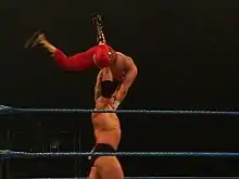On October 8, 2005, Lesnar won the IWGP Heavyweight Championship on his debut match in a three-way match with Kazuyuki Fujita and Masahiro Chono at a New Japan Pro-Wrestling (NJPW) show in the Tokyo Dome.[72] Lesnar is one of the few American wrestlers to have held this title.[72] He won the match by pinning Chono after an F-5, which he had renamed the Verdict since WWE owns the trademark on the F-5 name.[73] After the match, Lesnar stated that this name was referring to his lawsuit against WWE, who filed a motion for a temporary restraining order to prevent Lesnar from continuing to work with NJPW on December 6, but the court did not grant it. Following that, he had two non-title victories against Manabu Nakanishi and Yuji Nagata.[74][75] Lesnar successfully defended the championship on January 4, 2006, against former champion Shinsuke Nakamura.[74] On January 13, WWE once again filed an injunction against Lesnar to stop him from defending the IWGP Heavyweight Championship, which was also not enforced as he went on to retain his championship against former Sumo Wrestling Grand Champion Akebono on March 19, at the Sumo Hall.[76] Lesnar had another successful title defense against Giant Bernard on May 3. This was the first American vs. American title match in NJPW since Vader vs. Stan Hansen in 1990.[77] On July 15, NJPW stripped Lesnar of the IWGP Heavyweight Championship as he would not return to defend it due to "visa issues". A tournament was held on July 16 to determine the new champion, which was won by Hiroshi Tanahashi. Lesnar continued to possess the physical IWGP Heavyweight Championship belt until late June 2007.[78]