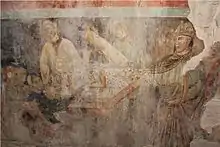 A stairway and the corridor with ceilings decorated by Tommaso Sandrini and Francesco Giugno (1574–1651) lead into the Chamber of the Podestà, divided into four rooms in the 16th century. The 9 meter height of the original room was reduced too and each of the four later rooms has a frescoed ceiling: Power restraining Fortune and Virtue on the clouds and afflicting the world by Antonio Gandino, Plenty in the second room, also by Gandino, and in the next two rooms two frescos by Tommaso Sandrini: The Allegory of Time in the third and allegorical female figures in the fourth. In the space between the vaulted ceiling of the registry and the beamed ceiling of the antique hall of Maggior Consiglio, there are two very old frescos from the second half of the 13th century: Knights taken Prisoner, partly obliterated on the north wall by an early 14th-century fresco of far finer workmanship, The Peace of Bishop Berardo Maggi.[1]
