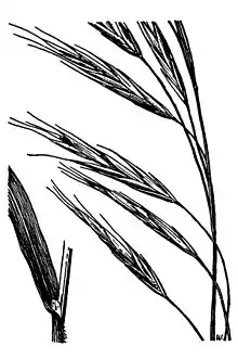 It is a perennial grass which may reach 1.1 meters in height. The inflorescence is an open array of spikelets, the lower ones drooping or nodding. The spikelets are flattened and have awns each up to a centimeter long at the tips of the fruits. This grass is considered a good forage for livestock and wild grazing animals.