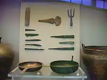 It is known that Middle Minoan bronze work flourished as an independent native art. To the very beginning of this epoch belongs the largest sword of the age, found in the palace of Malia. It is a flat blade, 79 cm long, with a broad base and a sharp point; there is a gold and crystal hilt but no ornament on the blade. A dagger of somewhat later date, now in the Metropolitan Museum of New York is the earliest piece of decorated bronze from Crete. Both sides of the blade are engraved with drawings: bulls fighting and a man hunting boars in a thicket. Slightly later again (MM III) are a series of splendid blades from mainland Greece, which must be attributed to Cretan craftsmen, with ornament in relief, or incised, or inlaid with gold, silver and niello. The most elaborate inlays, pictures of men hunting lions and cats hunting birds, are on daggers from the shaftgraves of Mycenae. These large designs cover the whole of the flat blade except its edge, but on swords, best represented by finds at Knossos, the ornament is restricted to the high midribs which are an essential feature of the longer blades. The type belongs to the beginning of the Late Minoan (Mycenaean) age. The hilt is made in one piece with the blade; it has a horned guard, a flanged edge for holding grip-scales, and a tang for a pommel. The scales were ivory or some other perishable substance and were fixed with bronze rivets; the pommels were often made of crystal. A rapier from Zapher Papoura (Knossos) is 91.3 cm long; its midrib and hilt-flange are engraved with bands of spiral coils, and its rivet-heads (originally gold-cased) with whorls. Ordinary Mycenaean blades are enriched with narrow mouldings, parallel to the midribs of swords and daggers, or to the curved backs of one-edged knives. The spearheads have hammered sockets. Other tools and implements are oval two-edged knives, square-ended razors, cleavers, chisels, hammers, axes, mattocks, ploughshares and saws. Cycladic and mainland Greek (Helladic) weapons show no ornament but include some novel types. A tanged spearhead has a slit (Cycladic) or slipped (Helladic) blade for securing the shaft; and the halberd, a west European weapon, was in use in the Middle Helladic Greece. There are few remains of Mycenaean metal armour; a plain cheek-piece from a helmet comes from Ialysos in Rhodes, and a pair of greaves from Enkomi in Cyprus. One of the greaves has wire riveted to its edge for fastening.[1]
