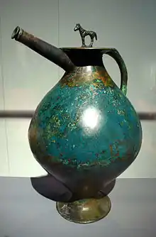 The bowl and stand were favourite archaic forms. The Greek stand was a fusion of the cast-rod tripod and the embossed cone. Some early examples have large triangular plates between the legs, worked in relief; but the developed type has separate legs and stays of which the joints are masked with decorative rims and feet and covering-plates. These ornaments are cast and chased, and are modelled in floral, animal and human forms. The feet are lions' paws, which sometimes clasp a ball or stands on toads; the rims and plaques bear groups of fighting animals, warriors, revelles or athletes, nymphs and satyrs, or mythological subjects in relief. Feasters recline and horsemen gallop on the rims of bowls; handles are formed by single standing figures, arched pairs of wrestlers, lovers holding hands, or two vertical soldiers carrying a horizontal comrade. Nude athletes serve as handles for all kinds of lids and vessels, draped women support mirror-disks around which love-gods fly, and similar figures crown tall shafts of candelabra. Handle-bases are modelled as satyr-masks, palmettes and sphinxes. This is Greek ornament of the 6th and later centuries. Its centres of manufacture are not precisely known, but the style of much archaic work points to Ionia. Etruscan fabrics approach their Greek originals so closely that it is not possible to separate them in technique or design, and the Etruscan style is no more than provincial Greek. Bronze was quite plentiful in Italy, the earliest Roman coinage was of heavy bronze, and there is literary evidence that Etruscan bronzes were exported. The process of line engraving seems to have been a Latin speciality; it was applied in pictorial subjects on the backs of mirrors and on the sides large cylindrical boxes, both of which are particularly connected with Praeneste. The finest of all such boxes, the Firconi cista in the Villa Giulia at Rome, bears the signature of a Roman artist. These belong to the 4th and 3rd centuries BC. Greek mirrors of the same period are seldom engraved; the disk is usually contained in a flat box which has a repoussé design on its lid.[1]