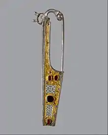 Brooches were known as fibula (plural fibulae) prior to the Middle Ages. These decorative items, used as clothes fasteners, were first crafted in the Bronze Age. In Europe, during the Iron Age, metalworking technology had advanced dramatically. The newer techniques of casting, metal bar-twisting and wire making were the basis for many new objects, including the fibula.[1] In Europe, Celtic craftsmen were creating fibulae decorated in red enamel and coral inlay, as early as 400 BC.[2]