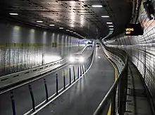 The Brooklyn–Battery Tunnel consists of two 2-lane tubes, one in each direction. They pass underneath the East River, connecting the Battery at the southern tip of Manhattan to the neighborhood of Red Hook in Brooklyn. Although the tubes do not pass directly under Governors Island, that island contains a ventilation building for the tunnel.[2] Vehicles over 12 feet 1 inch (3.68 m) and wider than 8 feet 6 inches (2.59 m) are prohibited from using the tubes.[3] The tubes stretch 9,117 feet (2,779 m) from portal to portal,[4] making them the longest continuous underwater vehicular tunnels in North America.[5][6] At the time of its opening, the Brooklyn–Battery Tunnel was the longest underwater vehicular tunnel in the United States and the second-longest in the world, behind the Queensway Tunnel under the River Mersey in England.[7][8]