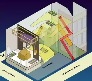The theatre occupied an L-shaped lot, with the Proscenium theatre occupying the 127-by-70-foot (39 m × 21 m) wing fronting Johnson Street. The stage and scene doors opened onto Johnson Street from this wing. The scene doors were 20 ft wide (6.1 m), large enough to accommodate scenic flats and large props.[23] The stage doors were smaller but could accommodate people carrying heavy loads. These Johnson Street doors were utilitarian and little used by the public.[24] The shorter 27-by-40-foot (8.2 m × 12.2 m) wing on Washington Street housed the main entrance to the lower floors and a separate staircase to the third floor theatre gallery. They were for public use, and Jackson considered these main entry ways to be large enough to discharge a full house of 1,450 people in less than five minutes.[25]