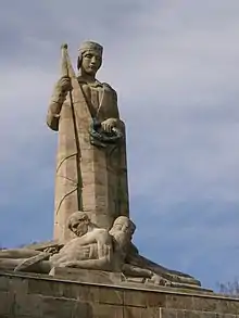 The cemetery consists of an area of 9 hectares in northeastern Riga, 5 kilometers from the city center. It borders the First Forest Cemetery and Rainis Cemetery.[4] The memorial expresses national gratitude to the fallen heroes through cultural references to the Latvian nation.[5] The main gate of the cemetery is 10 meters high and 32 meters wide. To either side of the entrance, on 2 meter high platforms are 3.3 meters high sculptures each representing a pair of ancient Latvian horsemen. The riders and horses in the right hand sculptural group have straight stances; one of the horses has its head thrown back, and upward movement dominates in the group. This is in contrast to the left hand group, which is dominated by downward movement as expressed through the bowed heads of the riders and horses; the riders have lowered their shields and the flags they are carrying. Above the entrance the dates 1915 (when the first burials in the cemetery were made) and 1920 (the last year of the Latvian War of Independence) are displayed; between the two dates the gate is decorated with the coat of arms of Latvia.[6] From the main entrance the 205 meters long Road of Thoughts leads through an avenue of linden trees to the Terrace of Heroes, encircled by an oak grove planted in 1923.[4][6][7] The terrace, paved with slabs of tufa, is about 73 meters wide and 78 meters long; in its center is placed the 1 meter high altar of sacred fire.[4] In the 1930s a sacred fire was lit on it on important holidays. It was later redesigned as a gas-fed eternal flame. As the Terrace of Heroes rises above the Road of Thoughts it hides from sight the central burial ground, which is on a lower level than the Road of Thoughts, until one has crossed the terrace, which thus provides a panorama of the burial ground and forms a barrier between the worlds of the living and of the dead.[4] There is a parapet with flower altar on edge of the Terrace facing the burial ground.[6] At the outer end of the burial ground on 9 meters high base, which makes it visible from main entrance 457 meters away, there is a 10 meters high sculpture of grieving mother Latvia and her dead sons. The mother, dressed in stylized national costume, is holding a victory wreath of oak leaves made of bronze in her left hand and the national flag with the right hand. At her feet her fallen sons are lying under their shields, both holding swords in their hands. In the wall under the sculpture a cross is carved and there is a niche with a tray holding soil from 517 parishes of Latvia. This central group is sided by two 1.8 meters high sculptures of ancient Latvian warriors standing on 1.2 meters high bases, who symbolize the Regions of Latvia as they are bearing regional coats of arms on their shields - the two warriors to left symbolize Courland and Semigalia, while the two on right - Vidzeme and Latgale. The main burial ground is rectangular and encircled by walls. At the end closer to main entrance in the corners of the main burial field there are 3.6 meters high sculptures of wounded horsemen. Next to each sculpture there are staircases leading towards the outside of cemetery. Between the main burial ground and the Terrace of Heroes there is another, lower terrace with burials. At the bottom of the terrace on the main burial grounds there is Alto-relievo Fallen brothers. The graves on the burial ground are ordered in lines and there is hedge between each two lines. The grave markers are tufa or concrete slabs on them the name, surname, rank and lifetime of the fallen, or "unknown" (Latvian, nezinams) is written. The wall is decorated with coats of arms of cities and districts of Latvia. There are additional burial grounds to the left of main burial ground when looking from main entrance.