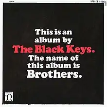 Brothers (printed as This is an album by The Black Keys. The name of this album is Brothers. on the front cover) is the sixth studio album by American rock duo The Black Keys.[1] Co-produced by the group, Mark Neill, and Danger Mouse, it was released on May 18, 2010 on Nonesuch Records. Brothers was the band's commercial breakthrough, as it sold over 73,000 copies in the United States in its first week and peaked at number three on the Billboard 200, their best performance on the chart to that point.