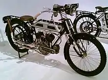 In 1913 William Brough developed a flat-twin engine in-line with the frame. This 497cc engine had overhead valves, 70mm bore and 64.5mm stroke, and had a magneto fitted above and a 2-speed gearbox below. By the end of 1914 it had replaced all other engines in the Brough range, and using it only 3-models were planned for 1915.[2] The three models were the HS - which was fitted with a two-speed countershaft gear operated by dog clutches, with chain drive to the gearbox, and John Bull rubber belt drive to the rear wheel over an adjustable pulley allowing the top gear range to be varied. No clutch or kick-start was provided. The second model was the HB, which was fitted with a Sturmey-Archer 3-speed hub gearbox and handle starter. The third model was the HTT, which was very similar to the HS but fitted with a specially tuned engine with high-compression, lightweight steel pistons, different camshafts, and special front cylinder lubrication.[3]
