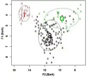 Brunei Malay has a three-vowel system: /i/, /a/, /u/.[2][8] Acoustic variation in the realisation of these vowels is shown in the plot on the right, based on the reading of a short text by a single female speaker.[3]