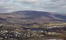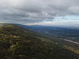 ![]() The higher southwest section of Brush Mountain looking southwest toward Altoona. Interstate 99 is lower right. The Allegheny Front is center right, with Blue Knob in the center. | |