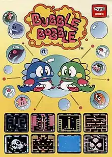 Bubble Bobble[lower-alpha 1] is a 1986 platform arcade game developed and published by Taito. It was distributed in the United States by Romstar, and in Europe by Electrocoin. Players control Bub and Bob, two dragons that set out to save their girlfriends from a world known as the Cave of Monsters. In each level, Bub and Bob must defeat each enemy present by trapping them in bubbles and popping, who turn into bonus items when they hit the ground. There are 100 levels total, each becoming progressively more difficult.