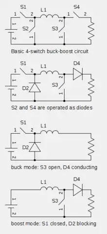 - The output voltage is typically of the same polarity of the input, and can be lower or higher than the input. Such a non-inverting buck-boost converter may use a single inductor which is used for both the buck inductor mode and the boost inductor mode, using switches instead of diodes,[2][3] sometimes called a "four-switch buck-boost converter",[4] it may use multiple inductors but only a single switch as in the SEPIC and Ćuk topologies.