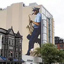 A tribute mural, sponsored by the District of Columbia Department of Public Works MuralsDC project and donated by Snell Properties, featuring Hill playing a saxophone in his mailman uniform, was unveiled on August 27, 2019, which Washington, DC Mayor Muriel Bowser declared “Roger Wendell Buck Hill Day” in the city. The mural, at just over 70 feet, is the tallest tribute mural in the nation's capital. It is located at 1925 14th Street, NW, on the side of the Elysium Fourteen building at the intersection of 14th and the historic U Street Corridor in northwest, DC, where noted African American artists performed from the 1920-1960s. The mural was painted by Tucson, AZ artist Joe Pagac.