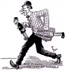 He introduced A. Mutt, the comic strip that would be better known by its later title, Mutt and Jeff, on November 15, 1907, on the sports pages of the San Francisco Chronicle. The featured character had previously appeared in sports cartoons by Fisher, but was unnamed. Fisher had approached his editor, John P. Young, about doing a regular strip as early as 1905, but was turned down. According to Fisher, Young told him, "It would take up too much room, and readers are used to reading down the page, and not horizontally."[2] During this time, newspaper cartoons appeared in a single-panel format. Fisher innovated by telling a cartoon gag in a sequence, or strip, of panels, creating the first American comic strip to successfully pioneer that since-common format. The concept of a newspaper strip featuring recurring characters in multiple panels on a six-day-a-week schedule actually had been created by Clare Briggs with A. Piker Clerk four years earlier, but that short-lived effort did not inspire further comics in a comic-strip format. As comics historian Don Markstein explained,