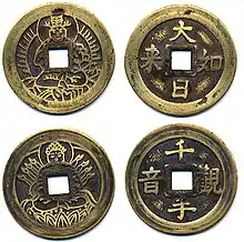 Japanese numismatic Buddhist charms are Buddhist charms often shaped like cash coins and bear inscriptions asking various figures from the Buddhist faith for blessings or protection, these inscriptions typically have a legend like "大佛鐮倉" ("(The) Great Buddha of Kamakura").[18] The Buddhist "且空藏棄" Japanese numismatic charm cast during the years 1736–1740 in Japan during the Tokugawa shogunate dedicated to the Ākāśagarbha Bodhisattva based on one of the favourite mantras of Kūkai is frequently found in China. Ākāśagarbha one of the 8 immortals who attempts to free people from the cycle of reincarnation with compassion.[3] These coins were brought to China in large numbers by Japanese Buddhist monks, another Japanese Buddhist charm frequently found in China has the inscription "南無阿彌陀佛" ("I put my trust in (the) Amitābha Buddha").[3]