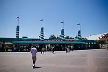 The park's main gate was extended outward to where the postcard letters formerly stood, and resembles the Pan-Pacific Auditorium, similar to the entrance of Disney's Hollywood Studios in Florida. The Red Car Trolley travels through the plaza.[8] The main gate was opened on July 15, 2011. The construction of the Red Car trolleys began on January 10, 2010. Construction of Buena Vista Street itself began in October 2010 and opened on June 15, 2012.[1] Throughout construction, the main entrance remained open with areas blocked off from time to time to aid in construction.