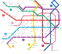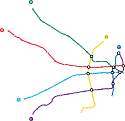 The network comprises six underground lines, labelled "A" to "E" and "H" and which are further identified by different colours, covering a total route length of 56.7 kilometers (35.2 mi) and serving 87 stations.[1] There is also one surface 7.4-kilometer (4.6 mi) Premetro line with an additional 17 stations.[1] Daily ridership was approximately 1.11 million in 2015.[1] With the current usage patterns, the entire system is overstretched, and during weekdays overcrowded and with insufficient services. An expansion programme is underway, and it is expected to enlarge the network to 97 kilometers (60 mi) in the future.[44] Similarly, new rolling stock has been incorporated across lines since 2013 to improve capacity and the last of the current orders are set to arrive in 2016 and followed by further orders of new rolling stock, which is expected to increase ridership figures to 1.8 million by 2019.[40]