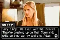 Although Buffy is the only playable character, other characters from Buffy the Vampire Slayer appear in cutscenes between levels.[6][7] These scenes are digitized stills from the series, and dialogue is conveyed through subtitles.[3] Buffy's boyfriend Riley Finn appears in certain areas to provide weapons and health in the form of presents.[11]