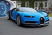 At the 2016 Geneva Motor Show, Bugatti premiered the Bugatti Chiron as a successor to the Veyron.[8][9] The pricing is set at 2.4 million euros. It is powered by a 7,993 cc (8.0 L) quad-turbocharged W16 engine with a peak power output of 1,103 kW (1,500 PS; 1,479 hp) at 6,700 rpm and 1,600 N⋅m (1,180 lb⋅ft) of torque starting from 2,000 to 6,000 rpm. It can accelerate from 0–97 km/h (0–60 mph) in 2.4 seconds according to the manufacturer and has an electronically limited top speed of 420 km/h (261 mph) (233–236 mph (375–380 km/h) without top speed key) for safety reasons, mainly arising from the tyres as the manufacturer concluded that no tyre currently manufactured would be able to handle the stress at the top speed the Chiron is capable of achieving. The base price is €2,400,000[10] (US$2,700,000 at the August 2016 exchange rate),[11] and buyers were required to place a €200,000 (US$226,000 at the August 2016 exchange rate) deposit.[11][12] Production is limited to 500 units. Unlike the Veyron, the Chiron is expected to make a profit.[13][14]