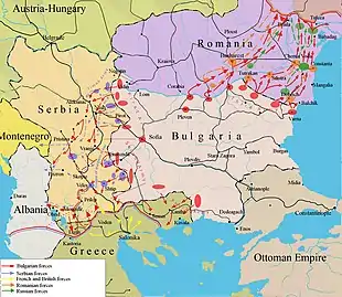 The treaty failed to make clear provisions for the division of the former Ottoman territories between the victors, which brought about the dissolution of the Balkan League. Geshov foresaw this outcome, which signalled the collapse of his goal of forming a permanent alliance directed against the Ottoman Empire, and resigned from his post as prime minister. He was replaced by the hard-liner Stoyan Danev.[13] The new government was not willing to compromise with Bulgarian claims in Macedonia, and neither were Serbia and Greece, whose interests were frustrated by the creation of an Albanian state. Russia, which was viewed as the patron of the Balkan League, was unable to control the situation and settle the disputes between the allies. The failure of Russian diplomacy, and the Entente Cordiale among Russia, France, and Great Britain that stood behind it, was a victory for Austria-Hungary, which sought to undermine the unity between the Balkan countries. In June, the new Bulgarian government was asked by the Bulgarian General Staff to either take aggressive action or order demobilization within 10 days. The senior Bulgarian commanders were concerned by the new alliance between Serbia and Greece and the growing restlessness in the army, which had been in the field since September 1912. Danev was preparing to leave for Russia where a new attempt to solve the problem was made by Tsar Ferdinand and General Mihail Savov, who decided to make a demonstration to Serbia, Greece and the Entente by ordering two of the Bulgarian armies to attack and consolidate their positions in Macedonia on 16 June.[14] More than a day later, Danev ordered Savov to stop the fighting and the latter obeyed, despite orders for the continuation of the attack given to him by the tsar. The Serbians and Greeks, however, were not willing to let this opportunity pass and declared war on Bulgaria.[14] Perceiving an opportunity to acquire Southern Dobrudja, Romania also invaded Bulgaria. The Romanian forces met with almost no resistance and was soon followed by the Ottoman Empire, which restored its control over Eastern Thrace.[15]