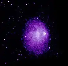 The Bullet Galaxy (RXC J2359.3-6042 CC) is a galaxy in the galaxy cluster RXC J2359.3-6042 (Abell 4067 or ACO 4067). The Bullet Galaxy is the sole component of one half of a cluster merger between the bulk of the cluster and this galaxy, which is plowing through the cluster, similar to how merging clusters Bullet Cluster and Bullet Group have merged. Unlike those two mergers, the Bullet Galaxy's merger is between one galaxy and a galaxy cluster. The cluster merger is happening at a lower speed than the Bullet Cluster, thus allowing the core of the Bullet Galaxy to retain cool gas and remain relatively undisturbed by its passage through the larger cluster. This cluster merger is the first one observed between a single galaxy and a cluster. The galaxy and cluster lies at redshift z=0.0992, some 1.4×109 ly (4.3×108 pc) away. The galaxy is traveling through the cluster at a speed of 1,310 km/s (2,900,000 mph).[1][2][3][4]