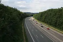 Bundesautobahn 45 (translates from German as Federal Motorway 45, short form Autobahn 45, abbreviated as BAB 45 or A 45) is an autobahn in Germany, connecting Dortmund in the west with Aschaffenburg in the southwest. It is colloquially known as the Sauerlandlinie (Sauerland line) as it runs through the hilly, rural Sauerland region between Hagen and Siegen. The A45 has many bridges to cross valleys, the highest of which is the Sichter Valley bridge (Talbrücke Sichter) between Lüdenscheid and Meinerzhagen at 530 metres above mean sea level. It is mostly two lanes each way with frequent climbing lanes between Dortmund-Hafen and the Gambacher Kreuz intersection. In March 2013 30 people were injured in a pile-up on the A45.