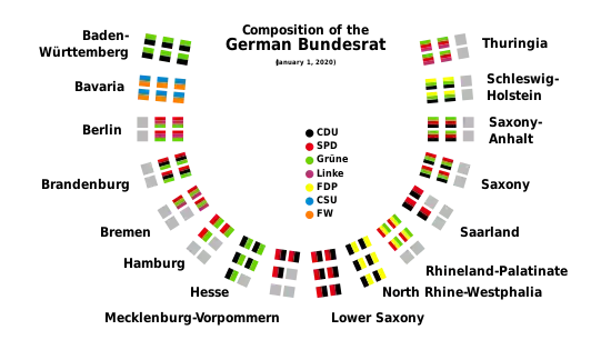 The German Bundesrat (literally ‘Federal Council’; pronounced [ˈbʊndəsʁaːt]) is a legislative body[lower-alpha 1] that represents the sixteen Länder (federated states) of Germany at the federal level (German: Bundesebene). The Bundesrat meets at the former Prussian House of Lords in Berlin. Its second seat is located in the former West German capital of Bonn.