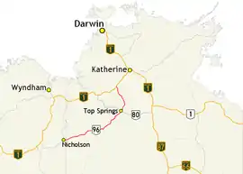 The Buntine Highway is a 581-kilometre highway in the Northern Territory and Western Australia. It runs from the Victoria Highway via Top Springs and Kalkarindji and then to Nicholson, Western Australia.[2] The section from the Victoria Highway to Kalkaringi is a single-lane sealed road with a few dual-lane sections; the remaining section is unsealed.[3] Funding for maintenance is provided by the Northern Territory government.[4]