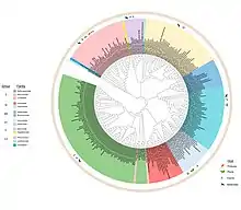 Bunyavirales is an order of segmented negative-strand RNA viruses with mainly tripartite genomes. Member viruses infect arthropods, plants, protozoans, and vertebrates.[2] It is the only order in the class Ellioviricetes.[3] The name Bunyavirales derives from Bunyamwera,[4] where the original type species Bunyamwera orthobunyavirus was first discovered.[5] Ellioviricetes is named in honor of late virologist Richard M. Elliott for his early work on bunyaviruses.[6]