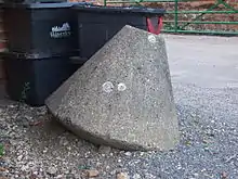 Buoys were intended as an alternative to a simple cylinder of concrete. The advantage of buoy was that it could be used to block or unblock a road quickly. Passing a rod or crossbar through a pair of buoys formed a wheeled axle that could easily be rolled into place; when the axle was removed the buoys could be separated and stood up. Although easily knocked over, the conical shapes could not be rolled very far, they would move unpredictably and out of the field of view of a tank driver, making it difficult to avoid them.[2] They were eventually judged to be ineffective and phased out.[3][4]