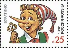 Buratino (Russian: Буратино) is the main character of the book The Golden Key, or the Adventures of Buratino (1936) by Aleksey Nikolayevich Tolstoy, which is based on the 1883 Italian novel The Adventures of Pinocchio by Carlo Collodi. Buratino originated as a character in the commedia dell'arte. The name Buratino is derived from the Italian burattino, which means wooden puppet or doll.[1] The book was published in 1936, and Buratino quickly became hugely popular among children in the Soviet Union, and remains so to this day (Buratino is one of the most popular characters of Russian children's literature). The story has been made into several films, including the animated 1959 film and the live action 1975 film.